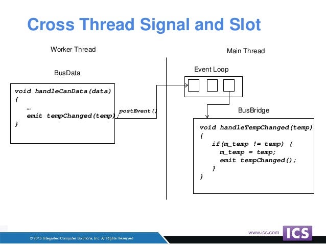 Signals and slots are loosely coupled: A class which emits a signal neither knows nor cares which slots receive the signal. Qt's signals and slots mechanism ensures that if you connect a signal to a slot, the slot will be called with the signal's parameters at the right time. Signals and slots can take any number of arguments of any type. All the information (slot to call, parameter values.) are stored inside the event. Copying the parameters. The argv coming from the signal is an array of pointers to the arguments. The problem is that these pointers point to the stack of the signal where the arguments are. Once the signal returns, they will not be valid anymore. If you were looking at the program source code, you'll see that it uses an infinite loop to do this with a block of code with instructions to keep sending the packets forever. One thing to call out is it should always be possible to break the loop by sending a certain signal. In the ping example, that signal is the user pressing Ctrl+C. I have all of the classes set up, compiling and running, but no signals are being emitted. So it seems as though there's no QEventLoop. Attempt 1: I modified my main class to subclass QThread instead of QObject, and in the run create a QEventLoop, connect all signals/slots, and exec the thread.